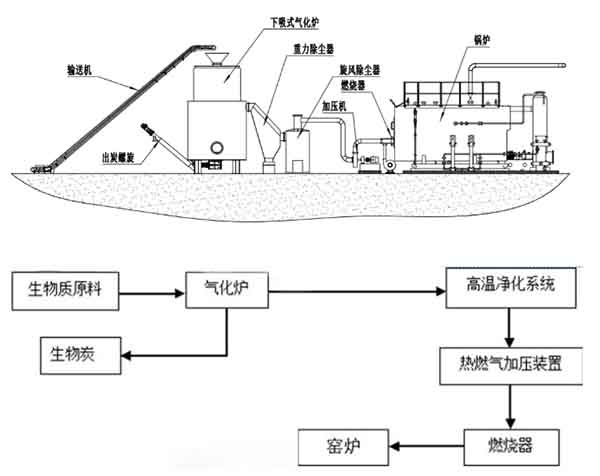 shengwuzhiyuanliaotongguoluoxuanjialiaojijiaruqihualu,erqihuasuoxuyaodekongqitongguogufengjicongqihualudibudepeifengzhuangzhijinruqihualunei,shengwuzhiyuanliaozaiqueyangzhuangtaixiaranshaoshengchengkeranqitihejiaoyou,bufenjiaoyouzaigaowenxiafashengerciliejieweibuningxingkeranqiti。refenjiexichudejiaotanyuranshaochanshengdeshuizhengqiheeryanghuatanjinxinghaiyuanfanying,chanshengqingqi、一氧化碳等可燃氣體,在氣體上升過程中,繼續進行還原和熱解反應。氣態焦油、氣體連同灰渣顆粒、焦(jiao)碳(tan)從(cong)氣(qi)化(hua)爐(lu)上(shang)部(bu)流(liu)出(chu),進(jin)入(ru)隨(sui)後(hou)的(de)燃(ran)氣(qi)淨(jing)化(hua)分(fen)離(li)裝(zhuang)置(zhi)旋(xuan)風(feng)除(chu)塵(chen)器(qi),進(jin)入(ru)旋(xuan)風(feng)除(chu)塵(chen)器(qi)絕(jue)大(da)部(bu)分(fen)灰(hui)渣(zha)通(tong)過(guo)旋(xuan)風(feng)除(chu)塵(chen)器(qi)從(cong)燃(ran)氣(qi)中(zhong)分(fen)離(li)出(chu)來(lai)。灰(hui)渣(zha)通(tong)過(guo)除(chu)灰(hui)裝(zhuang)置(zhi)、灰輸送裝置輸送到合適的地點。旋風除塵器分離出來的燃氣進入燃氣加壓裝置,被壓送到鍋爐燃燒機完全燃燒。